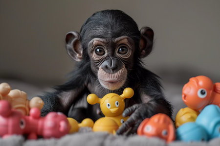 This captivating image shows a baby chimpanzee sitting amidst a variety of colorful children's toys. The expressive eyes and engaging environment highlight themes of learning, play, and the similarities between human and animal care for their young, suitable for educational, environmental, and wildlife presentations.