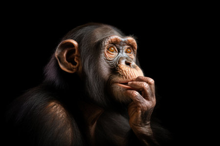 A black and white picture of a chimpanzee with a thoughtful look. Generative AI