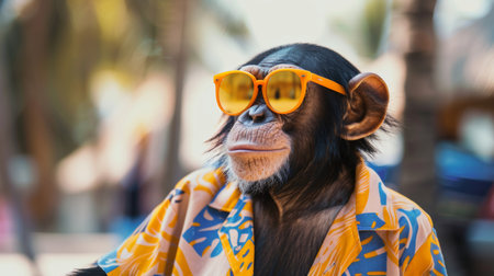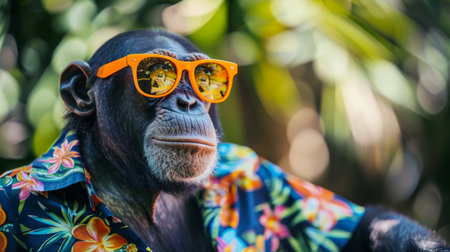 Stylish chimpanzee in vibrant attire orange sunglasses and colorful hawaiian shirt
