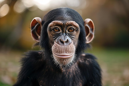 Close-up of a young chimpanzee with a soft-focus bokeh background, highlighting its facial features and expression, symbolizing wildlife and nature.