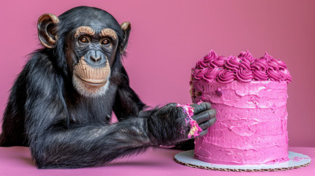 A cheerful chimpanzee delicately interacts with a vibrant pink cake.