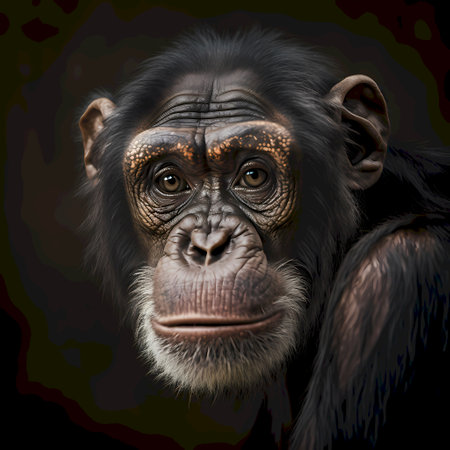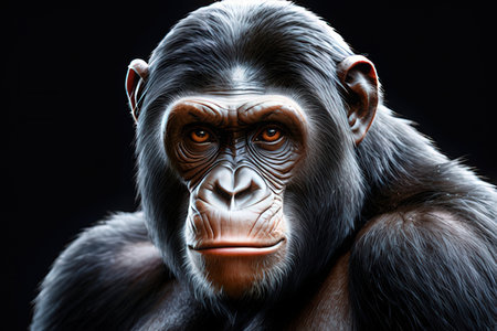 Extreme close-up photorealistic portrait of a chimpanzee with intricate fur texturing staring intensely at the viewer against a black backdrop.