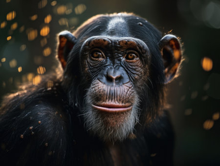 Close-up of a young chimpanzee with a soft-focus bokeh background, highlighting its facial features and expression, symbolizing wildlife and nature.