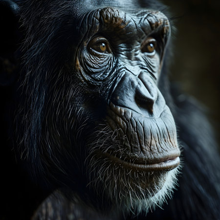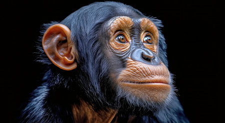 A chimpanzee gazes thoughtfully into the distance, its expressive face and deep eyes reflecting a moment of contemplation.