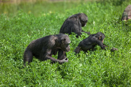 Bonobos in natural habitat on Green natural background. The Bonobo ( Pan paniscus), called the pygmy chimpanzee. Democratic Republic of Congo. Africa