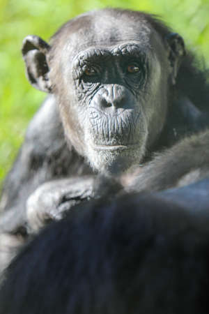 Chimpanzee, Pan troglodytes, common chimpanzee, robust chimpanzee, chimp with coarse black hair, bare face under the tree on the green grass. Portrait