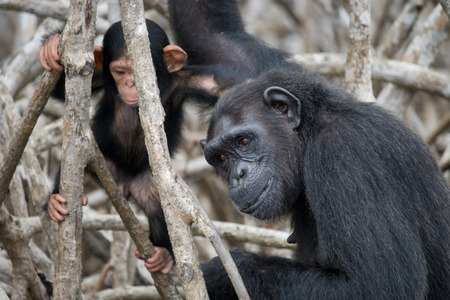 A female chimpanzee with a baby on mangrove trees. Republic of the Congo. Conkouati-Douli Reserve. An excellent illustration.