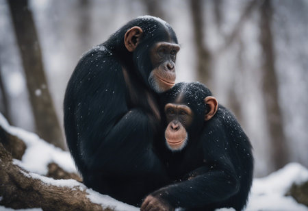Chimpanzee mother and baby cuddle in rainforest