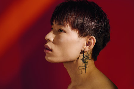 A handsome young man displays his stylish earring, highlighted by vivid colors.