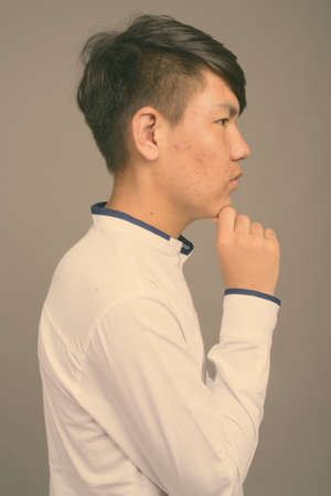 Young Asian teenage boy against gray background