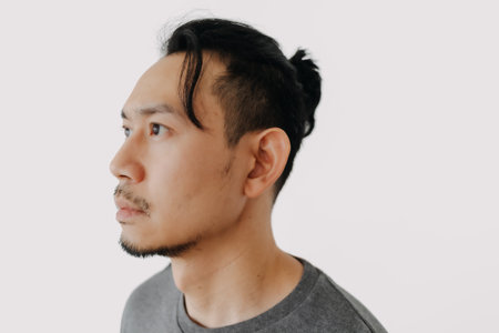 Close up head shot face of Asian man with man bun hair style isolate on white.