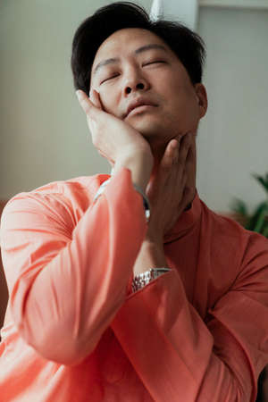 Asian man in orange tank top turning his head to the side, portrait of a young male in casual summer clothing