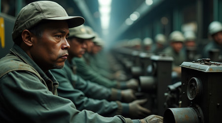 Group of factory workers operating heavy machinery on a busy production line.
