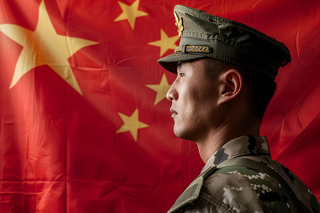 A Chinese soldier in camouflage uniform stands proudly in front of the Chinese flag, representing strength, loyalty, and dedication to his nation.