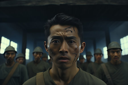 young asian soldier in retro uniform standing in front of comrades-in-arms