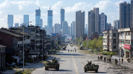 Troops navigate through a ruined city, surrounded by damaged structures and towering construction sites in an urban war zone, showcasing post-conflict resilience.