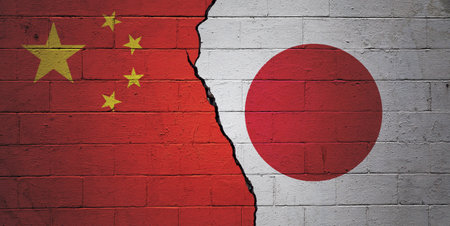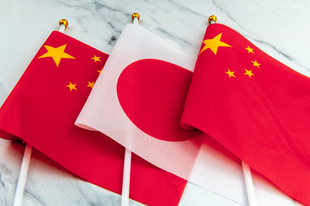 The national flag of Japan on flag pole in between the Chinese national flag. A Japan, China relations concept.