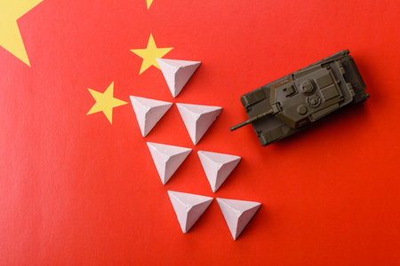 Military toy tank on China map flag. Geopolitical and strategic concept.