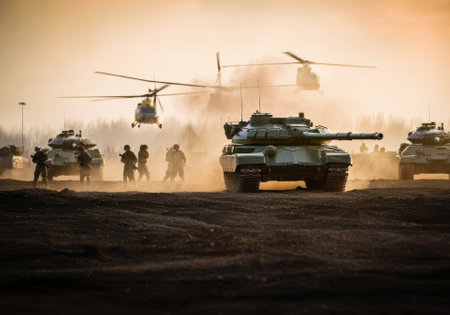 soldiers advancing in harsh terrain, tanks take center stage in modern warfare, traditional helicopters for both fighting and surveillance, military circles