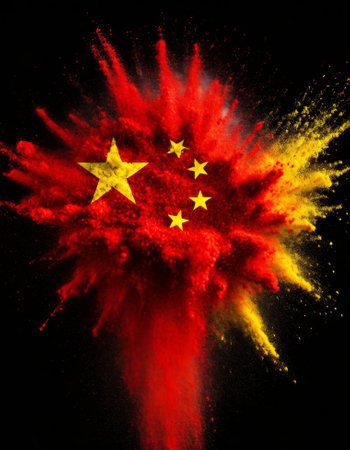 China colorful flag holi paint powder explosion on isolated background, generated by AI. High quality photo