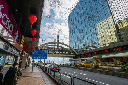 Hong Kong - 2020: Mody Lane by day, road and cross bridge between Empire Center and Tsim Sha Tsui Center, garlands and red chinese lanterns are above the street.