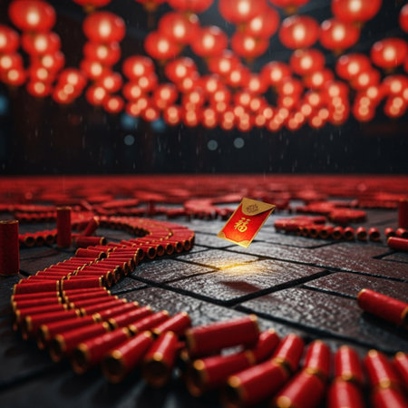 A close-up capture of a person selecting a vibrant red charm from a market stall filled with traditional decorative items, showcasing cultural celebration.