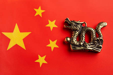 Figurine of dragon and Chinese flag on color background