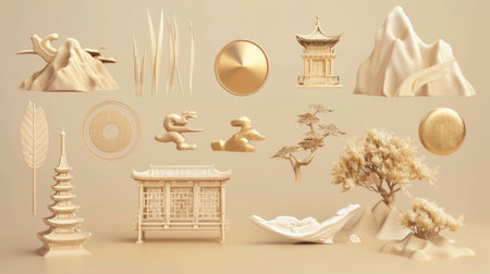 The set includes Chinese screens, golden discs, willow branches, and a variety of material mountains.