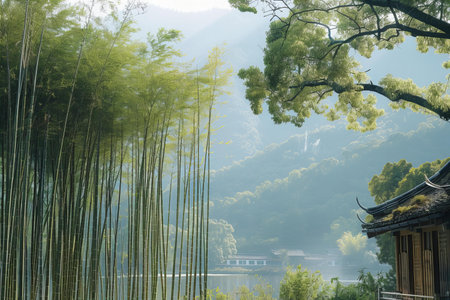 Bamboo forest and lake in the morning,Hangzhou,China.