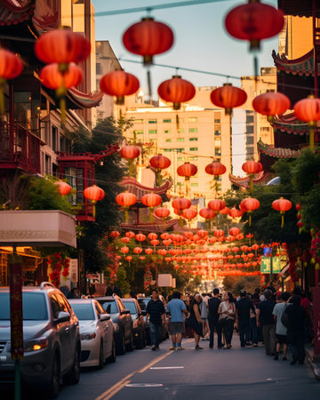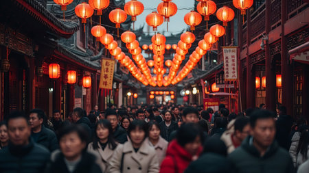 A sweeping, cinematic wide shot of a traditional street scene during the Lunar New Year. The composi