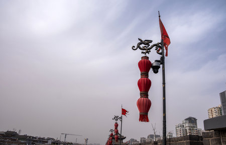 Traditional red lanterns and flag on a decorative pole along the historic Xi’an City Wall, modern skyscrapers background, blue sky.