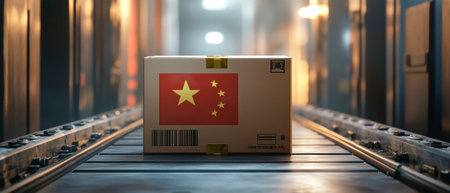 Beneath striking vertical skyscrapers, China and US flags showcase ongoing trade tensions in a bustling financial district.