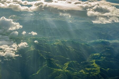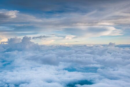 Clouds and sky as seen through window of an aircraft flying above the earth