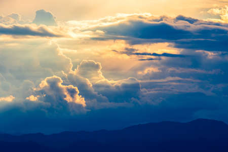 beautiful yellow sunlight of sun while sunrise or sunset with soft white cloud on sky for wallpaper or background, landscape top view of peak mountain at national park in asia-thailand