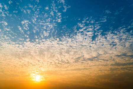 Cloudy sky at sunset or sunrise with bright sun. Abstract background for design.