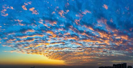 Sunset sky. Abstract nature background. Dramatic blue and orange, colorful clouds at twilight time.