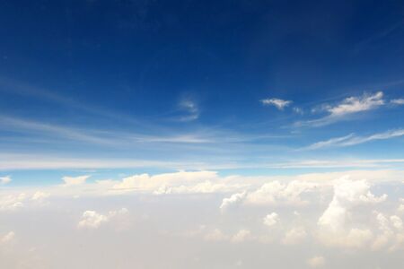 View of the cloudy sky from the airplane's window. Picture of the blue sky with white clouds. The foto that was made above the white cumulus. Picture of the white cumulus moving through the blue sky.
