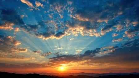 Witness a breathtaking sunrise over a picturesque mountain range, where vibrant clouds scatter light rays across a tranquil sky, creating a serene atmosphere.