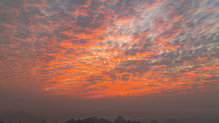A breathtaking aerial view of a dramatic sunrise illuminating the sky with vibrant orange and red hues over mist-covered karst mountains. The serene landscape, dotted with valleys and rivers,