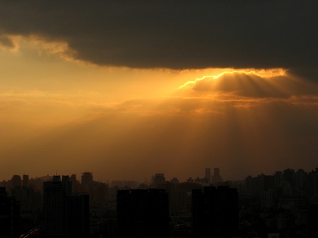 Sunset skyline over urban cityscape with high-rise buildings and distant mountains under golden sky