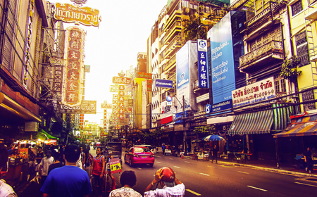 BANGKOK - MARCH 21: Busy Yaowarat Road in the evening on March 21, 2014 in Bangkok. Yaowarat Road is a main street in Bangkok's Chinatown, it was opened in 1891 in the reign of King Rama V.