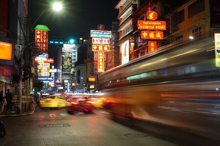BANGKOK-THAILAND - August, 18, 2017 : Bright signs of the stores restaurants and car on china town (Yaowarat) Road, Bangkok landmark street in Bangkok