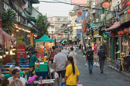 Bangkok, Thailand - March 16, 2023: People tourists walks in Chinatown district on street. Authentic architecture, local fast food markets and restaurants