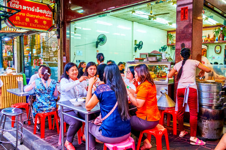 BANGKOK, THAILAND - APRIL 23, 2019: Locals in small outdoor restaurant at night market of Chinatown, on April 23 in Bangkok, Thailand