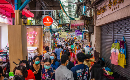 BANGKOK, THAILAND - APRIL 23, 2019: The chaotic activity on Chinatown's evening market next to Yaowarat Road, on April 23 in Bangkok, Thailand