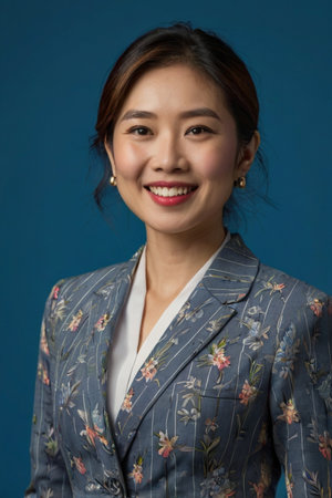 Studio shot of Cheerful portrait close up asian business woman while standing with suits with a blue background.