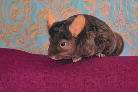 A young homemade brown chinchilla is sitting on the back of a sofa close-up.