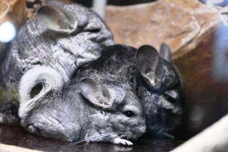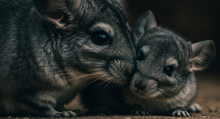 Close-up of two adorable chinchillas cuddling, showcasing their soft fur and endearing bond in a warm light.