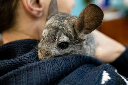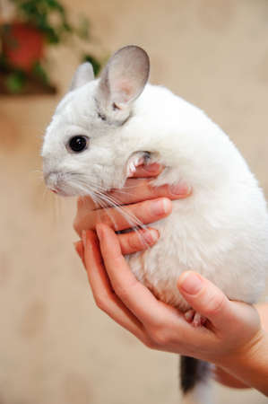 Little gray-white chinchilla sits on the hands