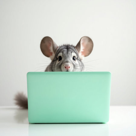 A gray chinchilla sits behind a mint green laptop. The scene combines pet photography with a humorous, modern everyday context, creating a playful and charming impression.